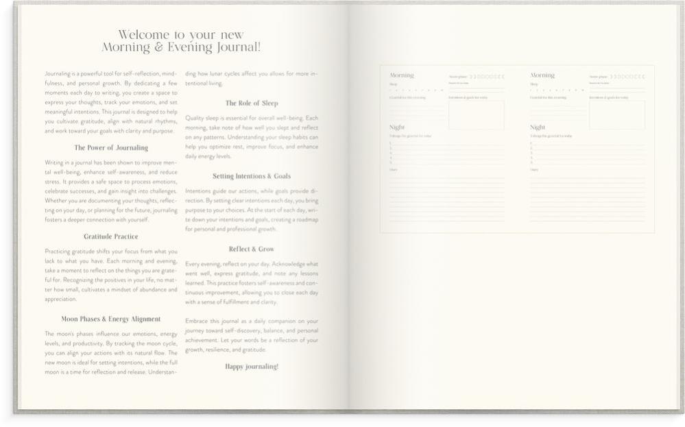 Den här morgon- och kvällsdagboken uppmuntrar dig att praktisera tacksamhet i vardagen genom reflektion. Det hjälper dig att skifta fokus mot det du har i stället för det du saknar. Ta en stund varje morgon och kväll för eftertanke. Genom att lyfta fram det som är positivt – oavsett hur litet det kan verka – bygger du upp en känsla av tacksamhet och välmående.