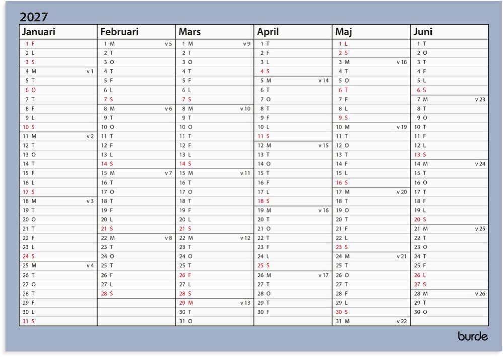 Få en överblick över året med detta stilrena väggblad. Perfekt för att hålla koll på födelsedagar, högtider och andra viktiga datum. Kalendern har ett halvår per sida och innehåller årsplan/årsplaner.
