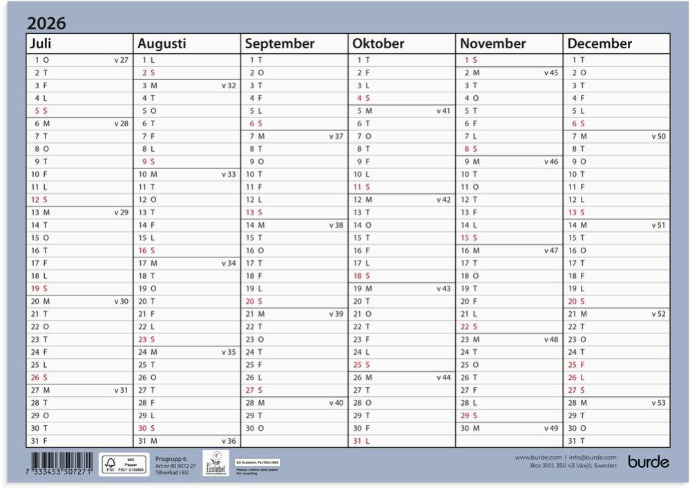 Kalender som väggblad för skolåret 26/27