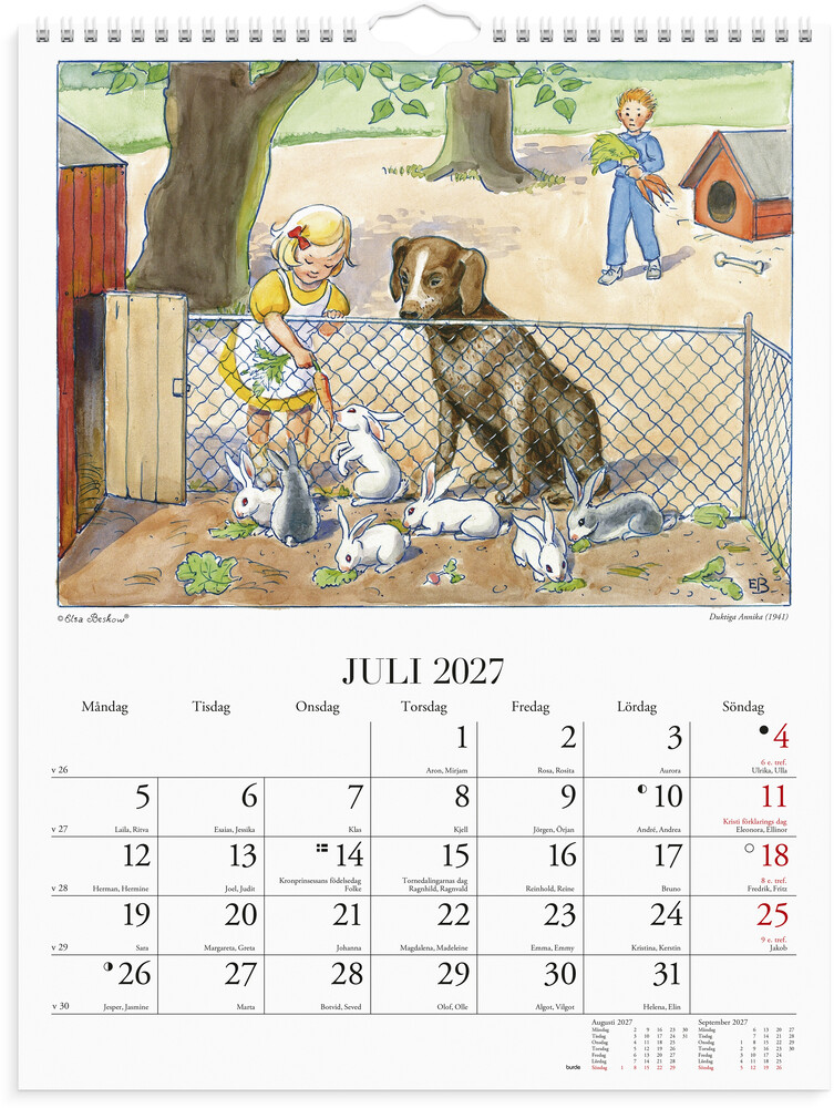Väggkalender med månadsbilder från välkända barnböcker av Elsa Beskow. Kalendern innehåller flaggdagar, helgdagar/aftnar, månfaser, namnsdagar och temadagar/händelser. Antal sidor: 12.