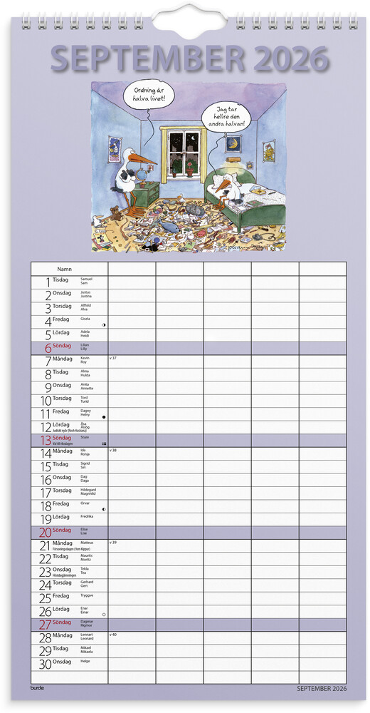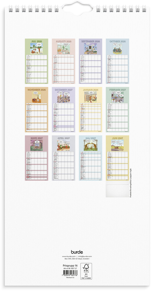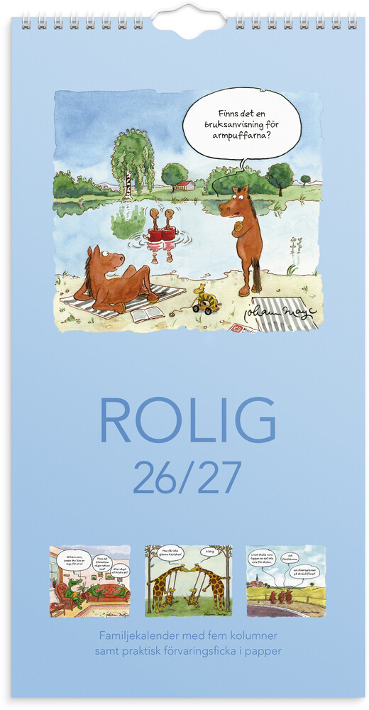 En vägghängd kalender med ny humoristisk bild varje månad. Underlätta vardagen med ett skratt! Kalendern innehåller 5 kolumner där alla familjemedlemmar får varsin kolumn att planera in aktiviteter och kom-ihåg. Kalendern har även en praktisk förvaringsficka i papper med plats för kvitton eller annat viktigt.